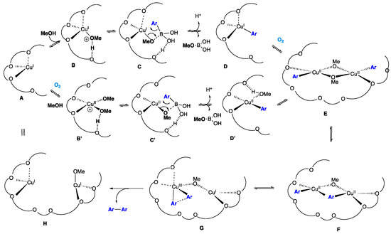 - Salamé, A.; Rio, J.; Ciofini, I.; Perrin, L.; Grimaud, L.; Payard, P.-A. Copper-Catalyzed Homocoupling of Boronic Acids: A Focus on B-to-Cu and Cu-to-Cu Transmetalations. Molecules 2022, 27, 7517. [Google Scholar] [CrossRef] [PubMed]