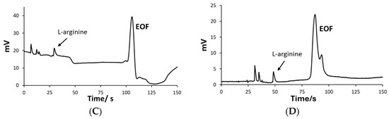 ME-C4D electropherograms for analyses of 5 × 10−5 M L-arginine standard solution in BGE consisting of (A) 2.4 × 10−9 M tartaric acid (5.8 pH), (B) 5.01 × 10−3 M citric acid (2.3 pH), (C) 9.11 × 10−3 M lactic acid (2.92 pH), (D) 9.5 × 10−3 M iminodiacetic acid (2.52 pH).