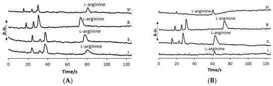 The ME-C4D electropherograms of 5 × 10−5 M L-arginine standard solutions in (A) BGE consisted of 0.2 M acetic acid and different concentration of iminodiacetic acid: (I) 1 × 10−4 M, (II) 5 × 10−5 M, (III) 1 × 10−5 M, and (IV) 5 × 10−6 M; and (B) BGE consisted of 1 × 10−5 M iminodiacetic acid and different concentration of acetic acid: (I) 0.4 M, (II) 0.3 M, (III) 0.2 M, (IV) 0.1 M.