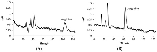 ME-C4D electropherogram for analysis of 5 × 10−5 M L-arginine standard solution in BGE consisting of (A) 0.5 M acetic acid (unmodified BGE) and (B) 0.3 M with 1 × 10−5 M iminodiacetic acid.