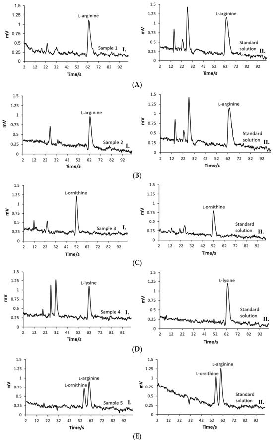 ME-C4D electropherogram for analysis of (A)(I) Sample 1, (A)(II) 5 × 10−5 M L-arginine standard solution, (B)(I) Sample 2, (B)(II) 5 × 10−5 M L-arginine standard solution, (C)(I) Sample 3, (C)(II) 2.5 × 10−5 M L-ornithine standard solution, (D)(I) Sample 4, (D)(II) 5 × 10−5 M L-lysine standard solution, (E)(I) Sample 5, (E)(II) the mixture of 5 × 10−5 M and L-arginine and 2.5 × 10−5 M L-ornithine standard solution.