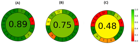 Results of overall greenness by AGREE analysis for (A) ME-C4D analysis, (B) CE-UV-VIS analysis of AAs, and (C) HPLC-DAD analysis of AAs. The third input criteria are set as an offline analytical method. The 1–12 refers to greenness score for each of 12 green analytical chemistry principles [54].
