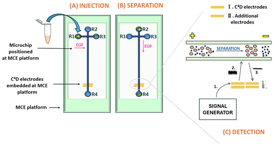 Visual representation of (A) injection, (B) separation, and (C) detection step in ME-C4D analysis. The pink arrows represent the direction of electroosmotic flow (EOF). Different colors illustrate various parts of the ME instrumentation: green denotes the ME platform, gray represents the microchip, blue highlights the injection and separation microchannels and reservoirs, and yellow indicates the C4D electrodes. The plus and minus signs denote the applied voltage.
