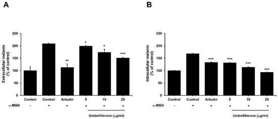 Effect of umbelliferone on melanin content. B16F10 melanoma cells were exposed to 100 nM of α-MSH with or without arbutin (1 mM) and umbelliferone (0, 5, 10, 25 μg/mL). Levels of both extracellular (A) and intracellular (B) melanin were quantified using optical density measurements at 490 nm. Each bar represents the mean ± SD of three independent experiments. * p < 0.05, ** p < 0.01 and *** p < 0.001 indicate significant differences compared with the α-MSH-treated control group.