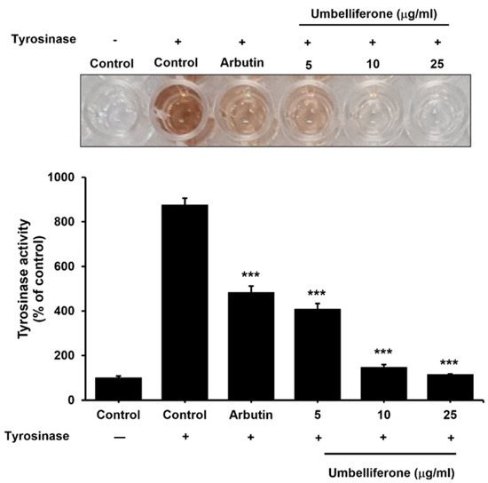 Effects of umbelliferone on tyrosinase activity. The mushroom tyrosinase solution was treated with arbutin (200 μM) and umbelliferone (0, 5, 10, 25 µg/mL), and melanin content was measured based on optical density at 475 nm. Each bar represents the mean ± SD of three independent experiments. Statistical analysis revealed a significant difference at *** p < 0.001 compared to the negative control with the mushroom tyrosinase solution.