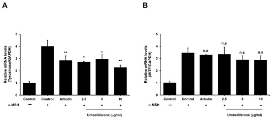 Effects of umbelliferone on mRNA expression. B16F10 melanoma cells were treated with 100 nM α-MSH alone or in combination with arbutin (200 μM) and umbelliferone (2.5, 5, 10 μg/mL). Quantitative real-time PCR was used to measure the expression levels of tyrosinase (A) and MITF (B). Each bar represents the mean ± SD of three independent experiments, with significance differences denoted by * p < 0.05 and ** p < 0.01 compared to the α-MSH-treated control group. n.s. indicates not significant.