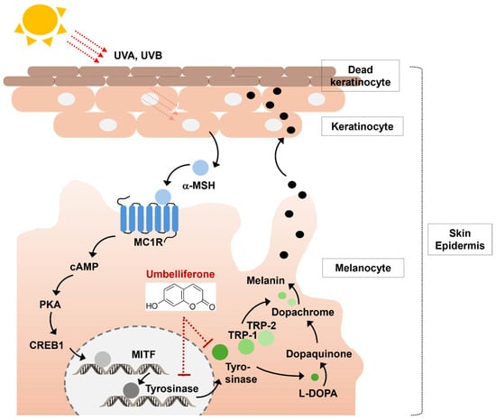 To determine the ability of umbelliferone to decrease tyrosinase protein levels in B16F10 melanoma cells, we investigated its effects on tyrosinase and MITF mRNA expression. Melanogenesis is controlled by genes related to this process, such as tyrosinase, TRP-1, and TRP-2, which are regulated by MITF [23]. MITF influences these genes by binding to their promoter regions [6]. To further elucidate the anti-melanogenic effects of umbelliferone, we examined its effects on tyrosinase and MITF gene expression. As shown in Figure 4A, the control group treated with α-MSH showed a fourfold increase in tyrosinase expression compared to that in the negative control. Treatment with umbelliferone at the specified concentrations significantly reduced tyrosinase expression, achieving the most notable decrease at a rate of 1.7-fold. Similarly, arbutin, known for its tyrosinase inhibitory properties, decreased tyrosinase expression by approximately 1.2-fold compared to that in the α-MSH-treated control group. However, as shown in Figure 4B, umbelliferone treatment did not lead to statistically significant changes in MITF expression levels. These findings strongly indicate that umbelliferone modulates melanogenesis primarily by suppressing tyrosinase expression without affecting MITF gene expression (Figure 5).