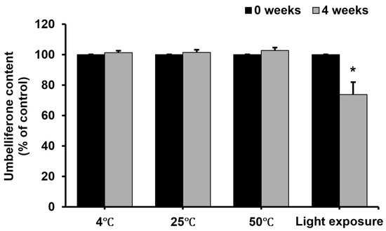 Stability of umbelliferone in a formulation at different temperatures and under light exposure. Stability of umbelliferone in a formulation at various temperatures (4, 25, and 50 °C) and under light exposure for 4 weeks. Umbelliferone content was quantified using a high-performance liquid chromatograph equipped with a C18 column. Each bar represents the mean ± SD of two independent experiments. Statistical analysis revealed a significant difference at * p < 0.05 compared to the untreated sample.