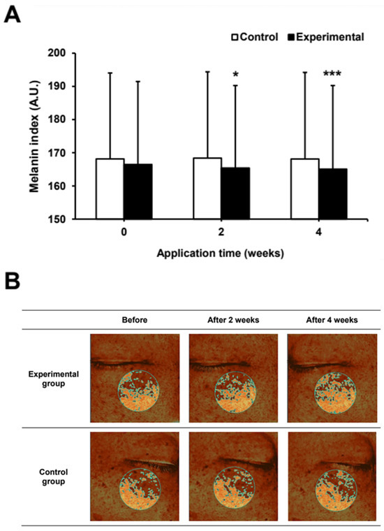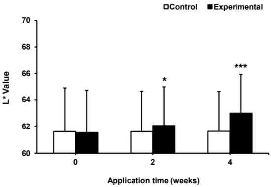 Effect of umbelliferone ampoules on skin tone. The L* value was measured at 2 and 4 weeks after applying the test ampoule (experimental group) containing 0.0025% umbelliferone, and the control ampoule (control group) without umbelliferone using spectrophotometry. Data represent the mean ± SD of three independent experiments, with statistical significance denoted as * p < 0.05 and *** p < 0.001 compared to the L* value before application (0 week) of the experimental ampoule containing umbelliferone.