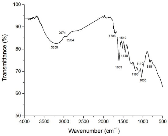 To characterize the structure of lignin from pecan shells, Attenuated Total Reflectance–Fourier Transform Infrared (ATR-FTIR) Spectroscopy was performed, with the results compared to the values reported in the literature [28,29]. The ATR-FTIR spectrum was recorded in the 500–4000 cm−1 region and revealed the presence of functional groups in different regions. It shows typical absorptions of aromatic molecules at 1603 and 1510 cm−1 assigned to the C=C stretching vibration, while the absorption at 1448 cm−1 is due to the bending vibration of methoxy groups of guaiacyl (G) and syringyl (S) units. The band at 1708 cm−1 was assigned to the stretching of carbonyl groups (C=O) in unconjugated ketones, conjugated aldehydes, and aromatic carboxylic acids. The band at 1110 cm−1 is assigned to the aromatic C-H in plane deformation of S units, while the band at 1030 cm−1 could be assigned to guaiacyl units. Finally, the band at 819 cm−1 was ascribed to the out-of-plane deformation of the aromatic rings of both S and G units (Figure 1).