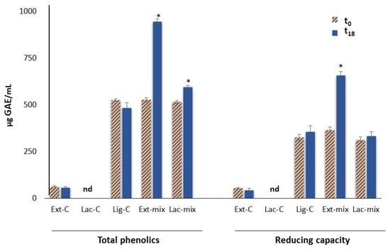 The total phenolics and reducing capacity detected in vitro in lignin solutions after enzymatic treatment with laccase (Lac-mix) or P. eryngii extract (Ext-mix), and with the corresponding controls: Lac-C, Ext-C, and Lig-C. The results are expressed as μg of gallic acid equivalents (GAEs)/mL of sample. Asterisks indicate a statistically significant difference in comparison to the baseline value (t0) (one-way ANOVA followed by Tukey’s post hoc test; p < 0.05).