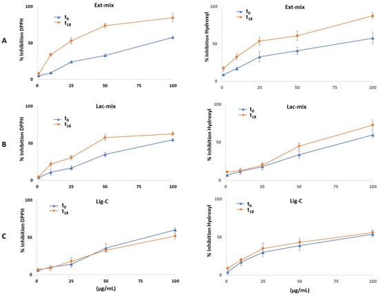 Antioxidant activity in vitro. The graphs represent the scavenging activities of lignin against the DPPH (left panel) and hydroxyl (right panel) radicals. (A): The lignin solution after enzymatic treatment with P. eryngii extract (Ext-mix); (B): the lignin solution after enzymatic treatment with laccase (Lac-mix); and (C): lignin solution control (Lig-C).