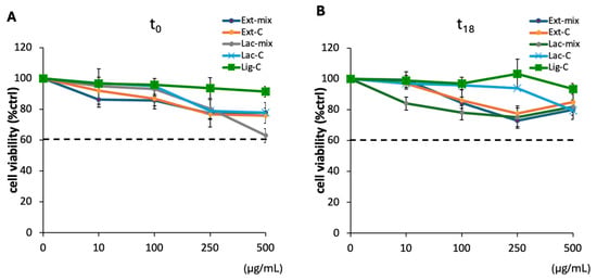 The effect of the different lignin solutions on cell viability. Confluent DI-TNC1 cells were treated with the Ext-mix and Lac-mix, as well as with the controls Ext-C, Lac-C, and Lig-C, both at t0 (A) and after incubation for 18 h (B). After 20 h of incubation at 37 °C and 5% CO2, DI-TNC1 were subjected to the MTT assay. The results are expressed as the percentage of surviving cells over untreated cells. Data are presented as mean ± SD of three different experiments with independent cell populations. The horizontal dashed line, set at 60%, indicates the threshold of cell viability. Concentrations of the samples that yielded cell viability values < 60% were considered as toxic doses.