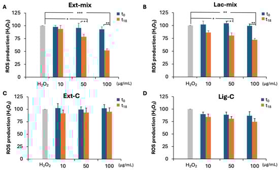We also evaluated the ability of Ext-mix and Lac-mix to counteract H2O2-induced ROS production in the DI-TNC1 cell line. As reported in Figure 5, a dose-dependent decrease in ROS production was observed in t18 samples of Ext-mix (Figure 5A) and Lac-mix (Figure 5B) but not in the corresponding controls (Figure 5C,D). By contrast, no protective effect was observed at t0 for all the preparations tested. A statistically significant decrease in ROS production was detected at the concentrations 50 and 100 μg/mL in Ext-mix, as well as in Lac-mix at t18, in comparison to H2O2 and to the corresponding samples at t0. In particular, as shown in Figure 5A,B, at the highest concentration tested, Ext-mix was able to reduce the production of ROS by 55% compared to the 30% for Lac-mix. This last result confirms the synergic action of laccases and peroxidases present in the P. eryngii extract in enhancing the performance of the biodegradated lignin. The ability to counteract ROS production exhibited by Ext-mix but not by Ext-C, suggests that this effect is due to the presence of antioxidant compounds released by lignin following the degradation by ligninolytic enzymes contained in the P. eryngii extract, and not by endogenous antioxidant compounds of the mushroom such as polysaccharides or other low molecular weight molecules as vitamins and polyphenols [32,33]. In fact, although in a previous work the ability of polysaccharides of P. eryngii extract to counteract the production of ROS in the same cell line has been demonstrated [32], it should be emphasized that the experimental conditions used to prepare the extract used in this study did not allow for the extraction of the polysaccharide fraction. Furthermore, regarding the possible contribution of low molecular weight compounds, this can be excluded, since these compounds were removed from the extract following a passage through centrifugal filters with a cut-off of 10 kDa.
