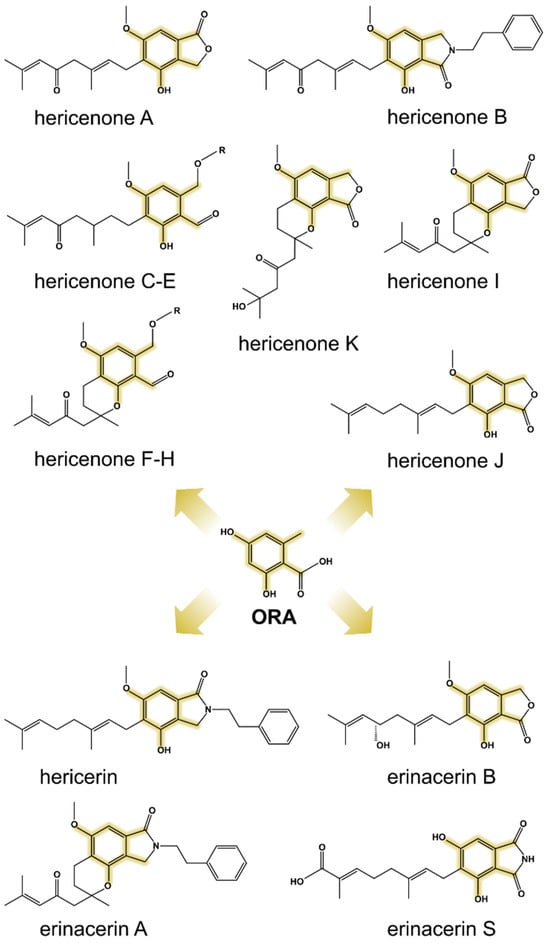 Revised structures [18] of some ORA-derived meroterpenoids from H. erinaceus. The orsellinic acid core is highlighted in yellow. For hericenones, R = palmitoyl (C, F), stearoyl (D, G), or linoleoyl (E, H).
