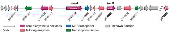 For the identification of putative PT-encoding genes, the sequences of StbC (UniProt acc. no. A0A193PS58) [34] and AscA (UniProt acc. no. A0A455R413) [35] were retrieved from the UniProt database [52] and submitted as search queries to phmmer (HMMER v3.3.2) [44] against the total proteome of H. erinaceus 0605. The cutoff was set at an E-value of 0.01 (Additional File S2). The Sequence Manipulation Suite [53] was used to calculate identity and similarity percentages between HerA, HerB, and g074890, and the corresponding homologous proteins from the stb and asc BGCs.