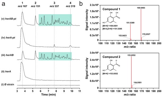 Heterologous production of orsellinic acid and orsellinic aldehyde in A. oryzae NSAR1. (a) Extracted ion chromatograms (ESI−) of fungal extracts displaying m/z 167 (1), 151 (2), 337 (3), 319 (4), and a series of m/z values ranging between 259 and 983 detected only in herA and herB co-expression strains (Additional File S3), highlighted by a green-shaded box. (i) A. oryzae NSAR1, background strain; (ii)–(v) her expression strains. To optimize the size of the figure, g074890 is abbreviated as pt in the strain labels. (b) HRMS2 spectra of orsellinic acid (1) and orsellinic aldehyde (2) in the fungal extracts. Spectra were recorded in positive ionization mode.