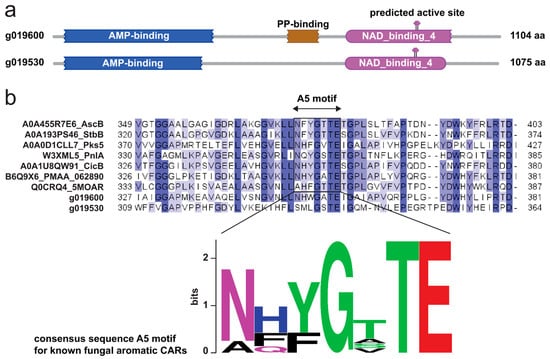 Criteria for selection of the CAR gene. (a) domain prediction performed with the HMMER webserver [43,44] indicated that g019600 has all domains needed for CAR activity, whereas g019530 seems to be missing the phosphopantheteine attachment site required for the activated substrate to be transported to the reductase domain. (b) MSA analysis of the two candidate genes and known fungal aromatic CARs from previous studies [33] shows a high degree of conservation within the key A5 motif of the adenylation domain for g019600, but not for g019530. The sequence logo for the A5 motif was generated with the WebLogo tool [45].