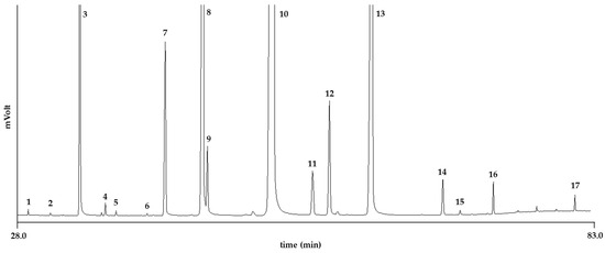 The content of chlorophyll (25.9 ± 0.8 mg kg−1) detected in the HSO used in our research is within the range reported by other authors [3,11,37,38]. Large differences in the content of chlorophyll in HSO have been reported. Having pro-oxidant and photosensitizer effects [17], its presence can affect the oxidative stability of HSO. For this reason, some processes can be applied to reduce its content in the final product (e.g., refining and bleaching). No process was applied in this sense on our oil, apart from natural decanting. Also, with regard to the quantity of carotenoids, a high variability is present in the literature data [39]. The value found in our sample (5.4 ± 0.2 mg kg−1) is higher than that reported by Izzo et al. [11] but lower than that of other authors [36,37].