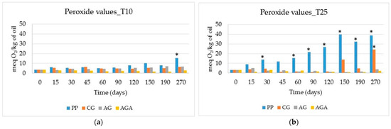 Trends in peroxide content during the storage period at 10 °C (a) and 25 °C (b). Vial materials: PP = polypropylene, CG = clear glass; AG = amber glass; AGA = amber glass covered with aluminum foil. ANOVA: * p < 0.05.