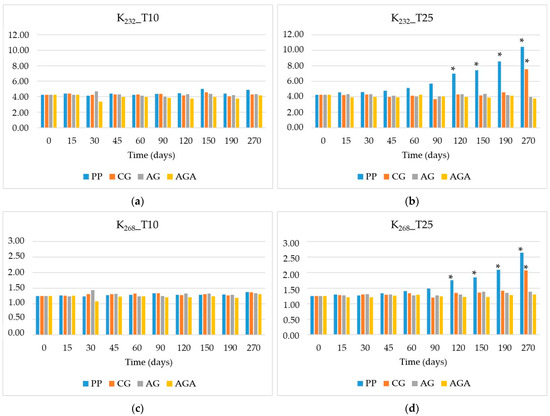 Trends in diene (K232) content at 10 °C (a) and 25 °C (b) and triene (K268) content at 10 °C (c) and 25 °C (d), during the storage period. Vial materials: PP = polypropylene, CG = clear glass; AG = amber glass; AGA = amber glass covered with aluminum foil. ANOVA: * p < 0.05.