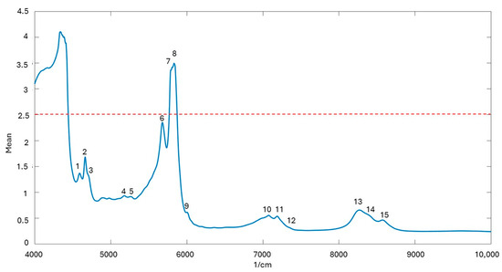 Mean NIR spectrum of the analyzed HSO samples. Numbers refer to specific wavenumbers, whose assignments are reported in Table 2. Dashed line at 2.5 absorbance units: threshold beyond which spectral data were discarded during the processing of data because of saturation effects.