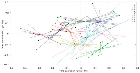 Spider score plots of PC1 for the time factor (1 = 15 days, 9 = 270 days; see Materials and Methods Section for the attribution of all times); explained variability, PC1 = 71.9% and PC2 = 24.5%.