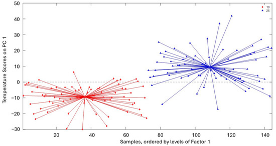 Spider score plots of PC1 for the temperature factor (10 °C and 25 °C).