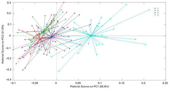 Figure 6 illustrates the spider score plots of PC1 and PC2 for the time factor, demonstrating that the samples’ spectral characteristics change notably over the storage period, with complex behavior around the starting time (time 1). It is noteworthy that the clusters for the data corresponding to times 1–6 exhibit greater radial symmetry around the centroid, whereas for the later time points, an elliptical dispersion becomes evident.