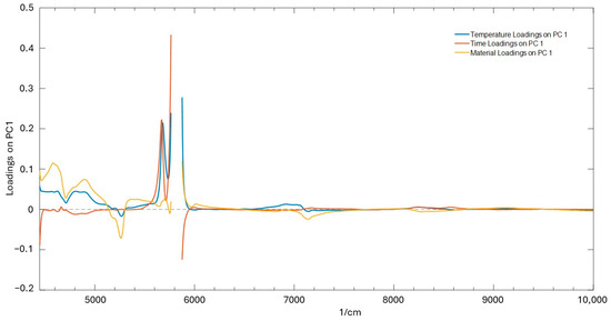 Figure 9 displays the overlay of the PC1 loadings for the three experimental factors (time, temperature, and material). The use of minimal data preprocessing (baseline correction applied to remove residual turbidity effects and centering on the mean) allowed for the maximization of the interpretability of the models. The PC1 loading for the “temperature” factor shows the significant weight of the symmetric and asymmetric second overtone signals of the methylenic groups in the aliphatic chains at 5678 cm⁻1 and 5892 cm⁻1, respectively. Similarly, in the case of the PC1 loadings, for the “time” factor, the most important bands are the same, but with a positive sign for the lower wavenumber band and a negative sign for the higher wavenumber band. In the case of the “material” factor, however, the greatest weight is given by signals attributed to the vibrations of double bonds between 4600 and 5180 cm⁻1. For the “temperature” factor, the strong loading of both symmetric and asymmetric methylenic group overtones indicates that temperature affects the integrity and conformation of the aliphatic chains in the fatty acids. Higher temperatures likely accelerate molecular motion and promote oxidation, leading to changes in these vibrational modes [45].