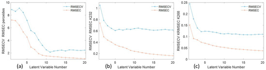 Graphs of Rmsec and Rmsecv as a function of latent variables for peroxides (a), dienes (b), and trienes (c).