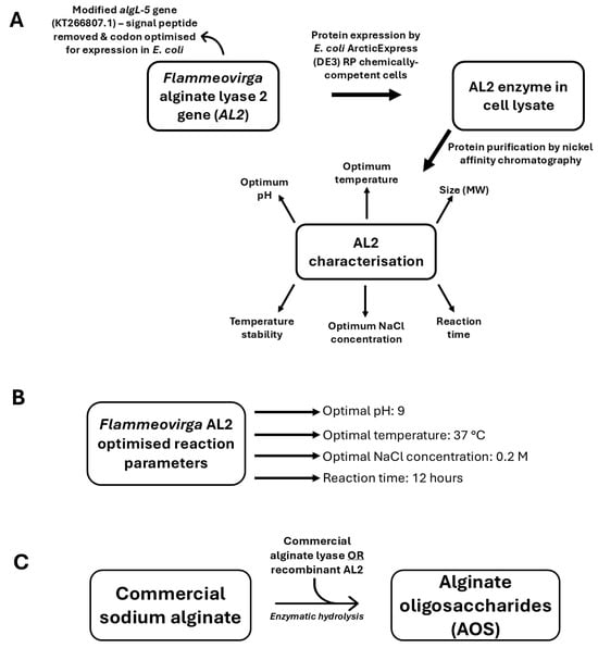 Flow chart summarising the workflow of this paper: (A) an outline of the expression, purification, and characterisation of Flammeovirga alginate lyase 2 (AL2); (B) optimised reaction parameters of the recombinant enzyme; and (C) a brief outline of the substrates and products involved in the hydrolysis reaction.