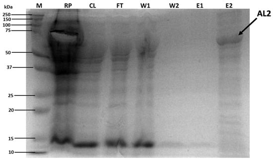 The samples collected during nickel-affinity chromatography purification were analysed on a 12% SDS-polyacrylamide gel to assess the purity of the recombinant enzyme after elution (Figure 3). As shown in Figure 3, a single, dominant, clear band, which is indicated by the arrow designated AL2, confirmed that the recombinant protein was partially purified by nickel affinity chromatography.