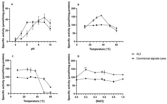 Biochemical characterisation of Flammeovirga sp. AL2 and a commercial alginate lyase regarding their optimum pH (A), temperature (B), thermal stability (C), and effect of NaCl concentration (D). Data points represent mean values ± SD (n = 3). ** denotes significant differences (p < 0.05) from the 0 M NaCl sample.
