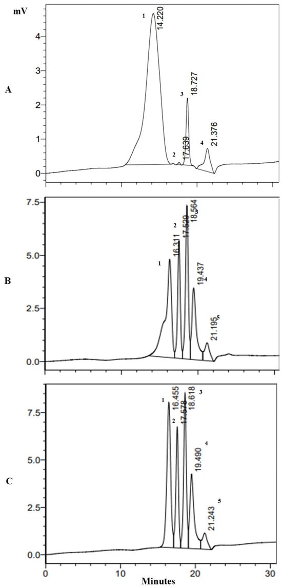 Alginate oligosaccharide molecular weight determination via HP-SEC on a Shodex OHpak SB-806M HQ (8.0 mm × 300 mm) column. (A) Unhydrolysed sodium alginate chromatogram (5 mg mL−1) (B) Alginate oligosaccharide fractions produced from sodium alginate hydrolysis by Flammeovirga AL2 (5 mg mL−1) (C) Alginate oligosaccharide fractions produced from sodium alginate hydrolysis by the commercial alginate lyase (5 mg mL−1). Numbers 1–5 represent fragment peak numbers.