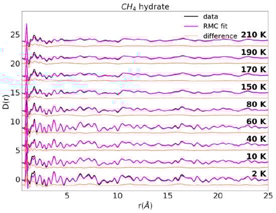 - Cladek, B.R.; Everett, S.M.; McDonnell, M.T.; Kizzire, D.G.; Tucker, M.G.; Keffer, D.J.; Rawn, C.J. Local structure analysis of low-temperature neutron pair distribution function coupled with molecular dynamics simulations of CH4 and CO2 hydrates from 2 to 210 K. Fuel 2021, 299, 120908. [Google Scholar] [CrossRef]