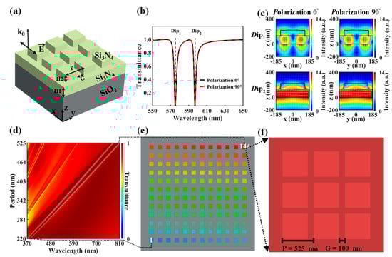 Figure 1b displays the transmittance of the GMRF, which has a period (P) of 370 nm and a gap (G) of 100 nm for both x- and y-polarizations. This demonstrates that the GMRF is not affected by polarization. Two distinct transmittance dips occur at wavelengths of 573.4 nm and 594.9 nm. The electric field pattern distribution of the two dips under x- and y-polarizations further demonstrates their polarization insensitivity, as shown in Figure 1c. The GMRF ensures equal sensitivity to light regardless of polarization, as indicated by the 0°–90° polarization simulation results shown in Figure S2 in the Supplementary Materials. This design prevents the need for a polarizer for filtering input light, hence augmenting the photon throughput to the detector array [,]. By manipulating the period of the nanopillars, it is possible to regulate the resonance wavelength. As shown in Figure 1d, increasing the nanopillar period from 220 nm to 525 nm extends the resonant wavelength range from 370 nm to 810 nm.