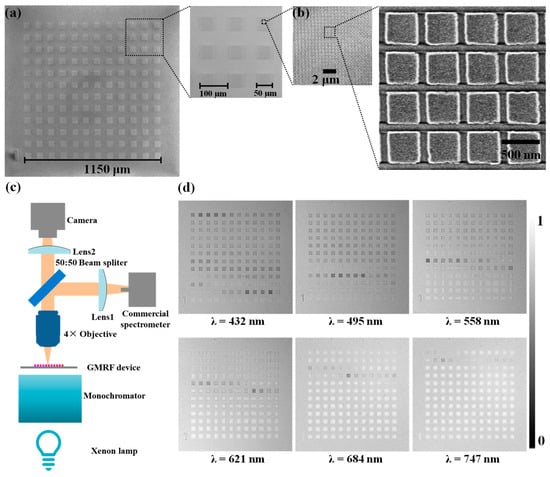 The calibration of the GMRF device. (a,b) SEM image of the GMRF device. (c) Homemade spectral filter detection setup. (d) The filtering effect of the GMRF device under different wavelengths.