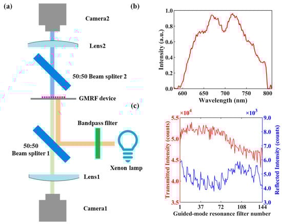 We created a test configuration to assess the luminous flux of the band-pass and band-stop filtering of the GMRFs, as shown in Figure 3a. Broadband light emitted from a xenon lamp is directed onto the GMRF device, with a band-pass filter removing light outside the test band. Camera 1 detects the reflected light, while Camera 2, an identical camera, measures the transmitted light. Due to the 50:50 beam splitter 1, the reflected light loses 50% of its energy. Another 50:50 beam splitter 2 is placed in the transmission path to compensate for this loss. To accurately compare the sensitivity of the band-pass and band-stop filters, it is essential to ensure that the image size of the filters is identical on both cameras and that the numerical aperture of the camera diaphragm is the same. Figure 3b shows the testing setup for the 144 GMRF device under broadband illumination. Figure 3c presents the average transmitted and reflected intensities for the 144 GMRFs. The results indicate that the transmitted band-stop intensities are more than seven times greater than the reflected band-pass intensities.