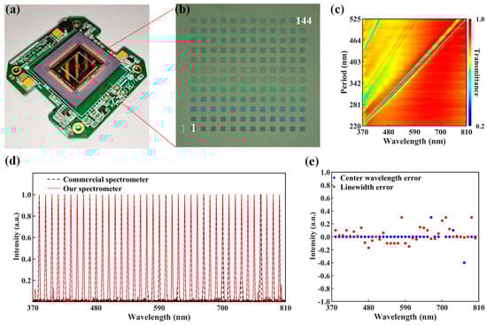 GMRF device-based micro-spectrometer. (a) Diagram showing the spectrometer mounted atop a CMOS image sensor and equipped with a GMRF device. (b) Microscope image of the GMRF device, the number 1 corresponds to a period of 220 nm, while the number 144 corresponds to a period of 525 nm. (c) Band-stop Ti(λ) transmittance profiles for the spectrometer as a whole. (d) Visible light spectrum narrowband measurements were obtained using both a commercial spectrometer and our spectrometer. (e) The reconstruction errors of the central wavelength and linewidth for the results in (d).