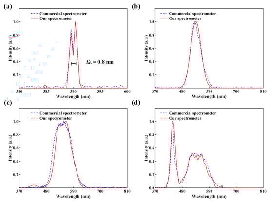 Spectrum measurements were obtained using both a commercial spectrometer and our spectrometer. (a) Both the commercial spectrometer and our spectrometer capture the spectrum of two narrow spectral lines. (b–d) show broad-spectrum measurements.