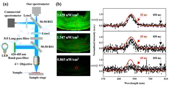 A vital feature of this platform is its exceptional sensitivity, which allows it to maximize the limited light available in compact devices. Our spectrometer’s spectroscopic sensitivity may be demonstrated using a sample of mouse jejunum for local fluorescence measurements. Figure 6a depicts the test configuration used for this investigation. A band-pass filter ranging from 420 to 485 nm is used to select the fluorescence excitation from the broadband light emitted by the LED source. Via a 4× microscope lens, light is reflected onto a fluorescent sample via a 50:50 beam splitter (BS1). Excitation light that is reflected, and fluorescence is collected by the same objective. The only light left over after excitation is the fluorescence signal, as all other signals have been removed by the 515 nm long-pass filter. The fluorescence is divided equally by a 50:50 beam splitter (BS2), with one beam incident on our spectrometer and the other beam entering the commercial spectrometer.