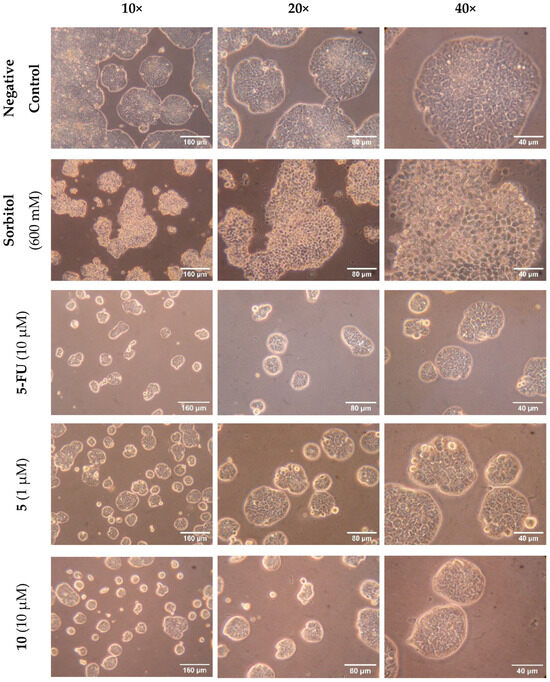 Microscopic images of Caco-2 cells treated 5-FU (10 µM), sorbitol (600 mM), and with cyanine dyes 5 (1 µM) and 10 (10 µM). Images were recorded at 10, 20, and 40× magnification after 72 h of incubation with 5-FU and dyes 5 and 10. Sorbitol was incubated for 24 h.