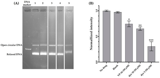 Results. (A) Agarose gel electrophoresis results displaying the effect of cyanines on topoisomerase II. Lane DNA marker: Linear pRYG DNA marker; Lane 1: includes pRYG DNA and the enzyme Topo II (“No drug” sample/Negative control); Lane 2: includes kDNA, Topo II and solvent (DMSO:Tris-HCl—1:9) used in sample preparation (“Blank” sample); Lane 3: includes pRYG DNA and Topo II in the presence of 50 µM VP-16 (etoposide), which is a proven Topo II poison (Positive control); Lane 4: pRYG DNA and Topo II in the presence of 50.0 µM cyanine dye 10; Lane 5: pRYG DNA and Topo II in the presence of 50.0 µM cyanine dye 5. In all samples, 5.0 units of enzyme and/or 250.0 ng of pRYG DNA were used. (B) Normalized band intensities for the selected relaxed DNA band were obtained by analyzing the image in (A). Normalization was performed based on the relaxed DNA band intensity in the negative control sample (“No drug” sample—Lane 1), which only includes the substrate (pRYG DNA) and the enzyme (Topo II). Band intensities were measured using the software Image Lab, Version 6.1 (BioRad Laboratories). Results are expressed as average values ± standard deviation of two independent assays. (*) p < 0.05; (**) p < 0.01 or (***) p < 0.001 versus “No drug” sample (relaxed DNA band of Lane 1).