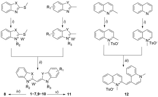 Synthesis of monomethine cyanine dyes 1–12. Conditions: (i) TsOR2–3, 120–140 °C or IR2–3, acetonitrile, reflux; (ii) GP1 (thioalkyl method via one-pot synthesis: 1° i); 2° pyridine, reflux) or GP3 (thioalkyl method: pyridine or triethylamine/ethanol, reflux) [17]; (iii) GP4 (potassium hydroxide method: KOH, ethanol, reflux) [17]; (iv) 7, HCl 25%, reflux; (v) 10, Raney nickel, ethylene glycol, hydrazine hydrate; X and Y are O, S, CH=CH, NCH3, or NCH2CH3; W is I or TsO; R1 is H, 5-NHCOCH3, (5 or 6)-NH2, (5 or 6)-NO2; R2, and R3 are CH3, C2H5, C5H11, or C10H21.