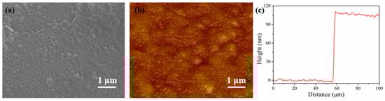 (a) FE-SEM image, (b) AFM image, and (c) step profiler analysis for pDPTD film.