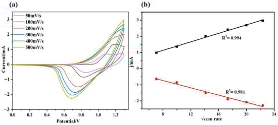 (a) CV curves of pDPTD at different scan rates from 50 to 500 mV/s in the 0.1 M TBAPF6/ACN solution. (b) The relationship between the peak current density and the square root of the scan rate.