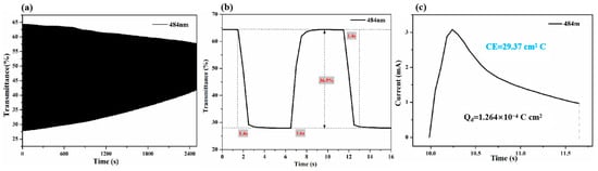 (a) The electrochromic stability for 250 cycles, (b) switching times of pDPTD under potentials between 0 V and 1.2 V (95% of the full switch), and (c) coloration efficiencies of pDPTD.