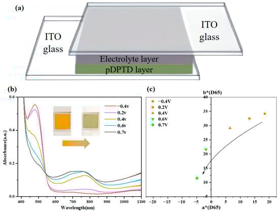 The spectral and chromaticity data of the device were tested using a combination of an electrochemical workstation and a UV–visible spectrophotometer or a colorimeter, where different voltages were applied using the electrochemical workstation, and the absorption spectra or chromaticity of the device at different voltages were measured using the UV–visible spectrophotometer or colorimeter. As shown in Figure 5, the device exhibited an obvious absorption peak around 480 nm at −0.4 V, and when the applied potential increased from −0.4 V to 0.7 V, the absorption peak at 480 nm decreased in intensity, and a new peak around 700 nm appeared and increased in intensity. Thus, the device showed a very similar spectra character to those of pDPTD polymer material. At −0.4 V, the device showed an orange-yellow color, with L*a*b* color coordinates of 88.5, 18.5, and 34.2. At 0.7 V, the device displays a pale green color, with L*a*b* color coordinates of 85.6, −4.8, and 11.5. During the whole electrochromism process, the device’s color changed gradually from yellow to green, as shown in Figure 5, indicating that the device could show several diverse yellow and green colors.