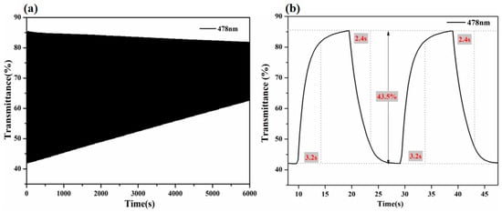 The cyclic stability, optical contrast, and switching times of the device were also tested using the combination of an electrochemical workstation and a UV–visible spectrophotometer. As shown in Figure 6, the device exhibited a large optical contrast of 43.5% at 478 nm, and the coloring and discoloring times of the device were calculated to be 3.2 s and 2.4 s, respectively. In comparison to the pure pDPTD polymer material, the device showed a similar color change with larger optical contrast and close switching times. Additionally, when the device underwent 300 cycles under the applied voltages between −0.4 V and 0.7 V, its optical contrast decreased from 43.5% to 20.1%, retaining 46% of its original optical contrast level, which was much better than that of pDPTD polymer material. The device exhibited good stability due to its packaging and the proper alignment of various functional layers within.